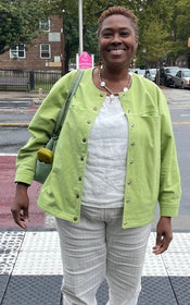 It’s a great choice for medium- to heavy-weight fabrics such as denim, corduroy, or cotton canvas. For a softer and more luxurious feel, wool fabrics work beautifully too—just be mindful of how they feel against your skin without a lining. To accentuate the jacket’s structured silhouette and unique details, we recommend choosing fabrics with texture or a bit of body. For summer, you can also make it in an airy linen or cotton fabric, which gives it more of a shirt-like look.
