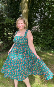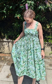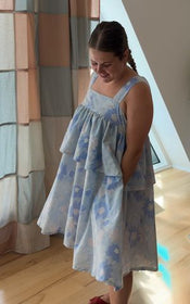 For Kaiko, fabric choices abound: from airy cottons to elegant viscose and silk (like) fabrics. Because the bodice piece is lined, you can also use very light fabrics, like chiffon, or embroidery fabrics. But even heavy fabrics, such as jacquard or denim will result in a nice effect. We made the blue dress from a double sided jacquard and it is quite thick. It gives firmness to the bodice and volume to the skirt part. So you don't have to be afraid to experiment with some heavier fabrics.