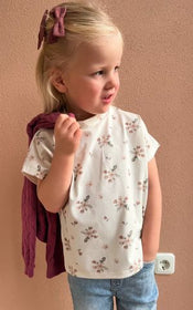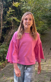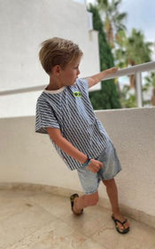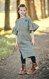 Willy features a straight fit with grown-on sleeves and a relaxed, roomy body. The design offers ample ease at the hips, and side slits at the hem provide added comfort. The hem lengths vary by style: the crop top ends at the waist, the T-shirt hem falls between the waist and hips, and the dress hem is calf-length. For smaller sizes (up to 6 years), the dress hem ends just below the knee.