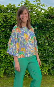 Zowel de top als de jurk zijn super comfy als je ze maakt in een gebreide stof of jersey. In dat geval maak je de halslijn met tricot halsboord. Maar door de wijde pasvorm zijn geweven stoffen ook heel geschikt. Kies voor doorvallende stoffen zoals middelzware viscose-mengelingen, tencel, bamboe, modal of cupro. Voor dikke stugge stoffen is dit model minder geschikt, er moet een zekere vloeibaarheid in de stof zitten.