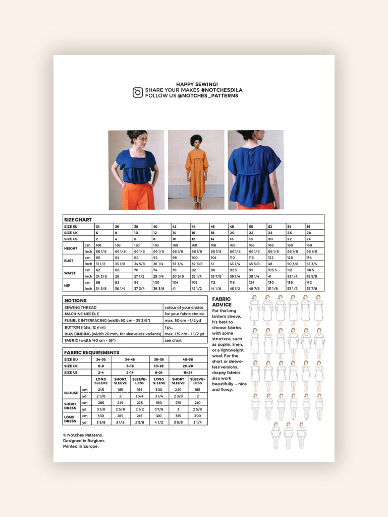 Het Dila-patroon valt op door de prachtige geplooide lantaarnmouwen — een detail waar je klanten meteen van zullen houden. Dit veelzijdige ontwerp kan gemaakt worden als jurk of blouse, met meerdere mouw- en halslijnopties die in het patroon zijn inbegrepen.