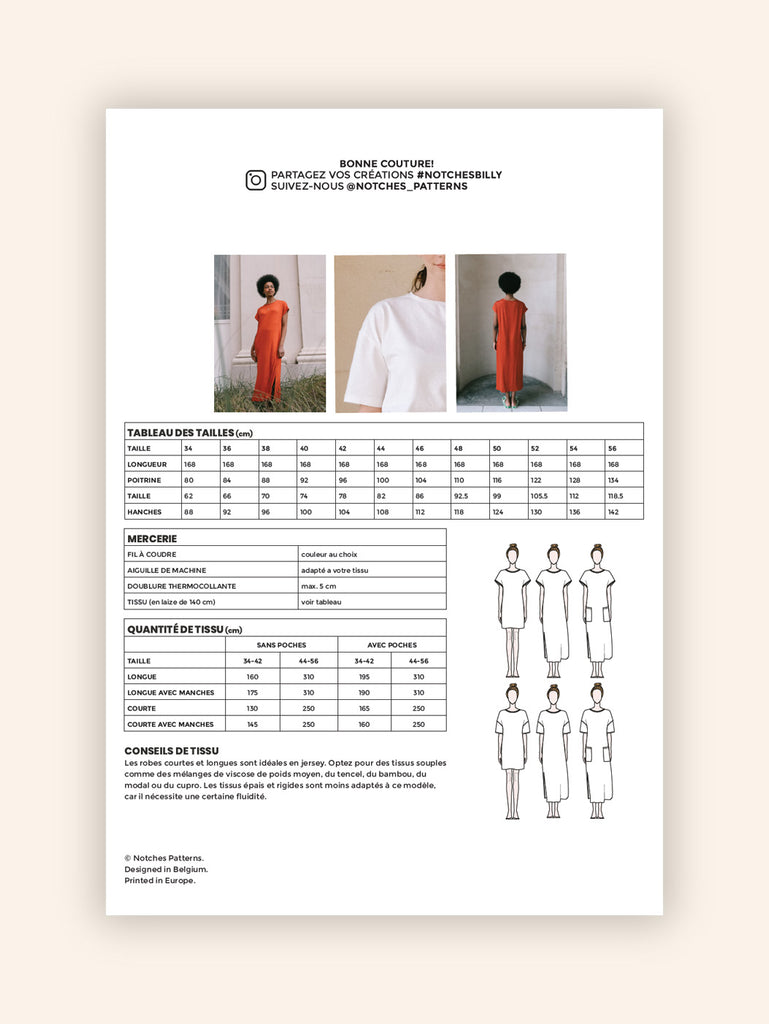 Billy présente une silhouette droite et ample, adaptée à de nombreuses morphologies. Elle ne comporte pas de pinces poitrine et est disponible en deux longueurs : au-dessus du genou ou mi-mollet. La version longue comprend des fentes latérales pour plus d’aisance. Les emmanchures sont généreuses, mais la version sans manches est conçue pour offrir une bonne couverture sans trop d’ouverture.
