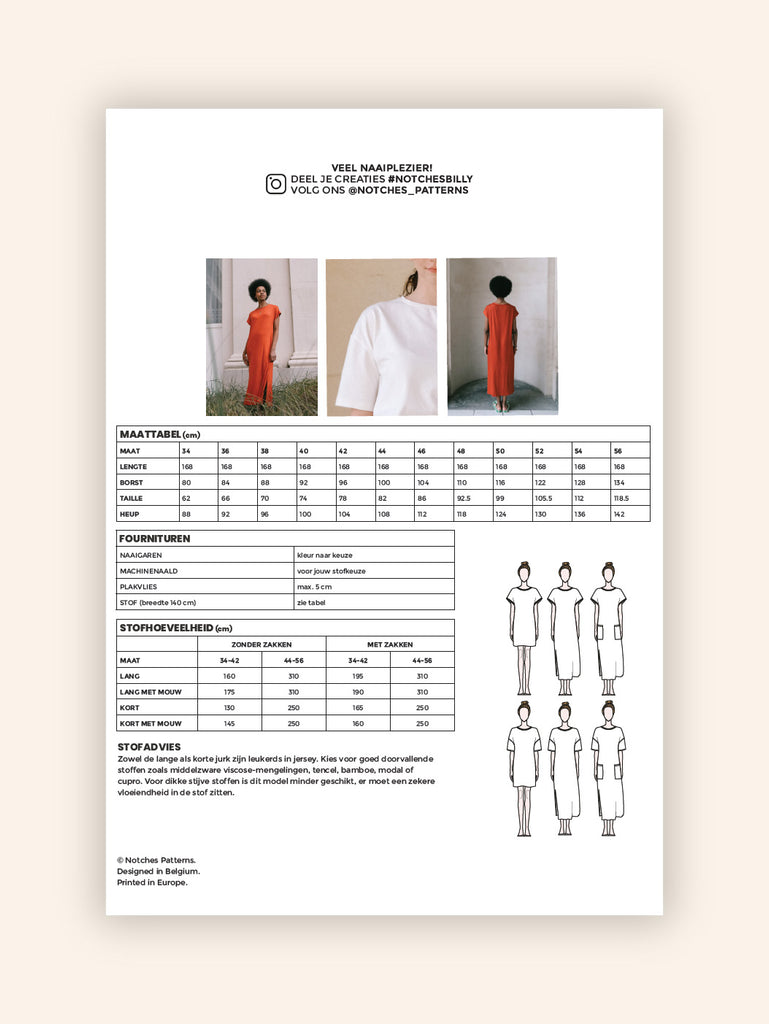 Billy heeft een losse, rechte snit die geschikt is voor verschillende lichaamstypes. Er zijn geen borstnepen, en de jurk is verkrijgbaar in twee lengtes: boven de knie of midi (halverwege de kuit).