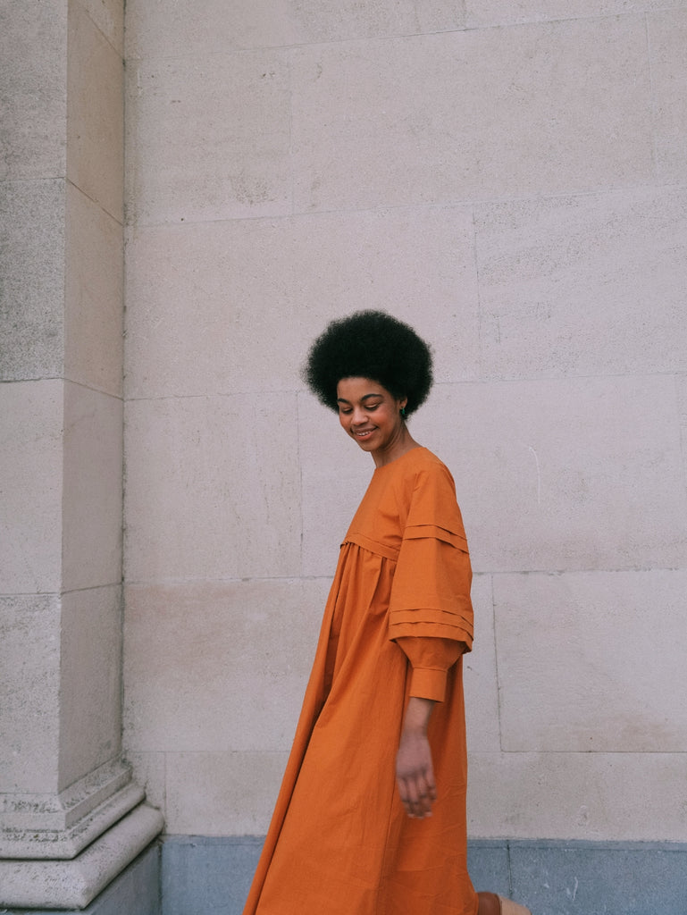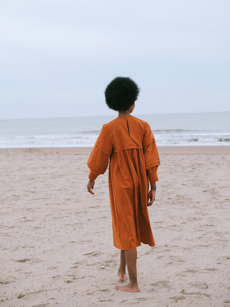 Dila alterne stratégiquement entre ampleur et ajustement. Le modèle offre beaucoup d’aisance au niveau de la poitrine, de la taille et des hanches, tout en conservant une silhouette sophistiquée grâce à des épaules bien positionnées et à la manche lanterne qui ramène les longues manches larges vers un poignet élégant.