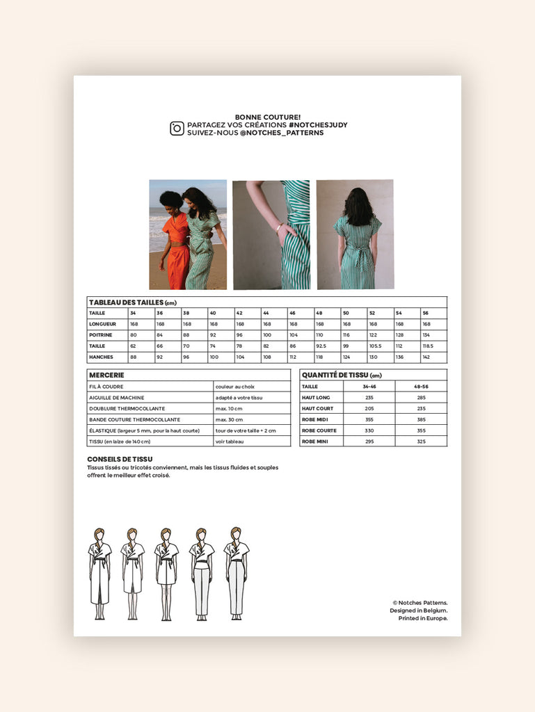 La robe et le haut Judy sont conçus pour offrir une coupe confortable : amples au niveau de la poitrine et des hanches pour s’habiller facilement, mais ajustés à la taille grâce à des liens réglables qui soulignent la féminité. L’emmanchure abaissée donne une manche courte fluide, tandis que le décolleté en V met joliment la silhouette en valeur.