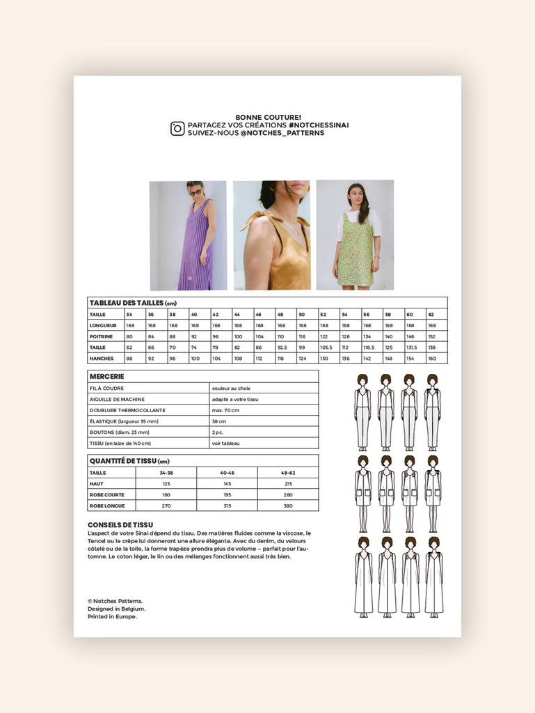Facile à intermédiaire (selon la variante choisie). Sinai est notée 2 sur 4 points — parfaite pour les débutantes confiantes. Commencez par un simple haut ou une robe à bretelles nouées, puis relevez le défi avec des poches, des fentes ou des finitions de bretelles plus travaillées. Les instructions vous guident pas à pas, pour que vous vous sentiez accompagnée tout au long du projet, même si vous débutez.